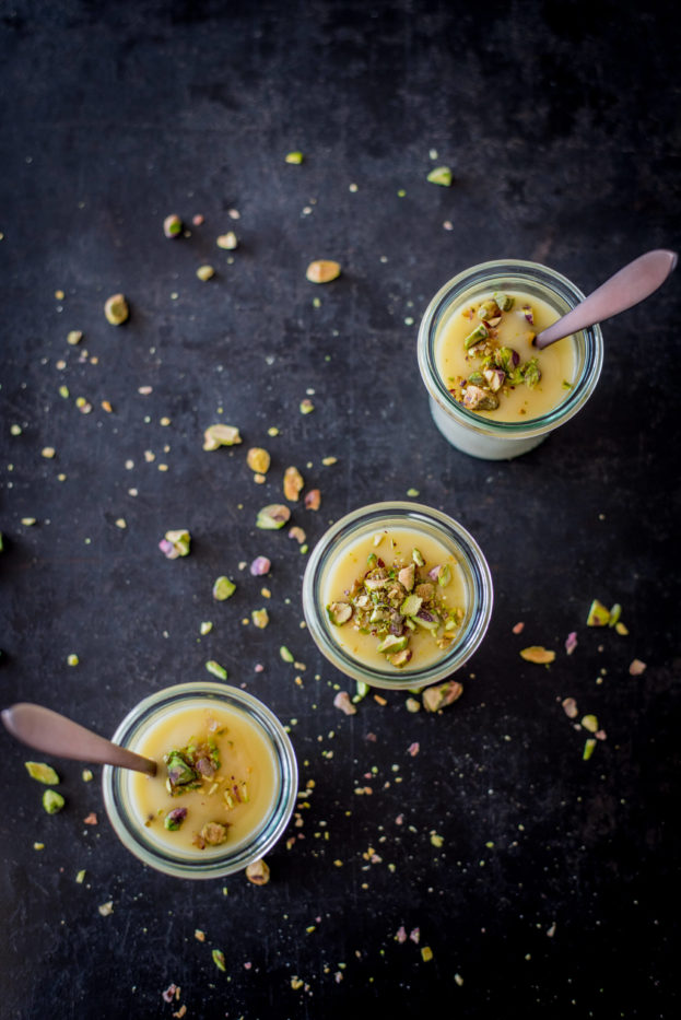 Vanille-Pannacotta mit Eierlikör und gerösteten Salz-Pistazien