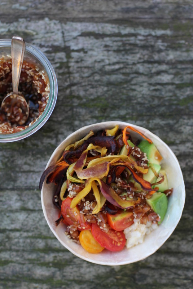 Heute wird es gesund auf dem Blog – also so richtig, richtig gesund! Ich selbst lege ja auch schon sehr viel Wert auf ausgewogene, nährstoffreiche und abwechslungsreiche Ernährung mit viel Gemüse und anderem frischem Zeug. Veronika ist jedoch absolute Expertin unter den Gesund-Bloggern. Auf ihrem Foodblog Carrots for Claire stellt sie unglaublich fantasievolle, mit Superfoods und natürlichen Nährstoffen gespickte Rezepte vor, die ihrer neuen Ernährungsweise entsprechen. Heute für uns dabei: Eine Getreide-Gemüsebowl mit Tamari-Dressing.