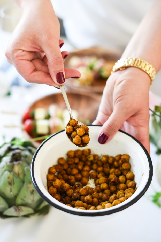 Snacks und Knabbereien sind ein Must-Have für jedes bunte Buffet. Herzhafte Kleinigkeiten, die den ganzen Abend bereit stehen und den kleinen Appetit zwischendurch stillen. Für unser Mädelsabend-Event mit den lieben Foodistas habe ich geröstete und afrikanisch gewürzte Kichererbsen mit Kokosöl beigesteuert, die ganz fix im Ofen gebacken sind und durch die afrikanische Gewürzmischung Raz el Hanout sehr fein würzig schmecken. Wir fanden: Mal eine sehr feine Alternative zu Chips & Co!