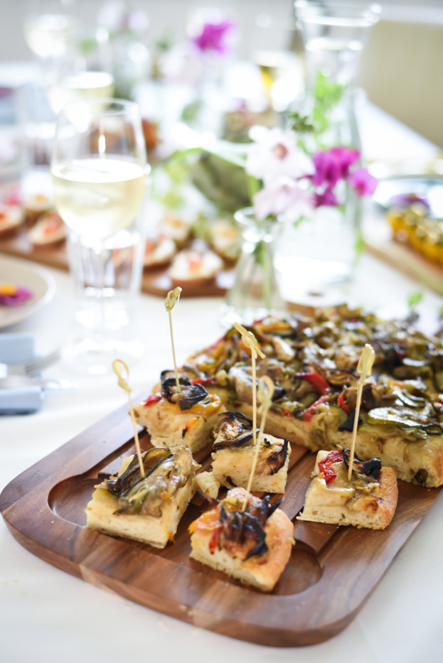Für einen geselligen Abend mit Freunden bietet es sich an, ein paar feine Snacks und Happen auf den Tisch zu bringen, die über mehrere Stunden verteilt immer wieder den kleinen oder größeren Hunger stillen. Hier ein Häppchen, dort ein Häppchen…Für unser „Mädelsabend“-Event mit den lieben Foodistas habe ich Brot und Antipasti in einem Rezept zusammen gebracht: Und zwar in Form einer lauwarmen Focaccia, knusprig gebacken aus dem Ofen, die durch allerlei frisches Antipasti-Gemüse ganz besonders saftig und herzhaft wird.