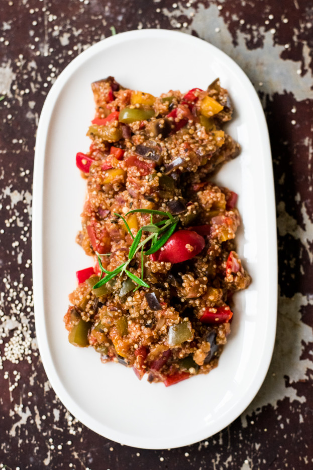 Quinoa-Risotto mit Paprika-Auberginen-Tomaten-Gemüse (vegan)