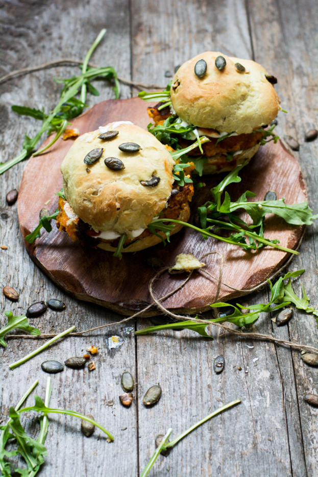 Veggie-Burger mit Kürbiskern-Buns und Süßkartoffel-Couscous-Patties