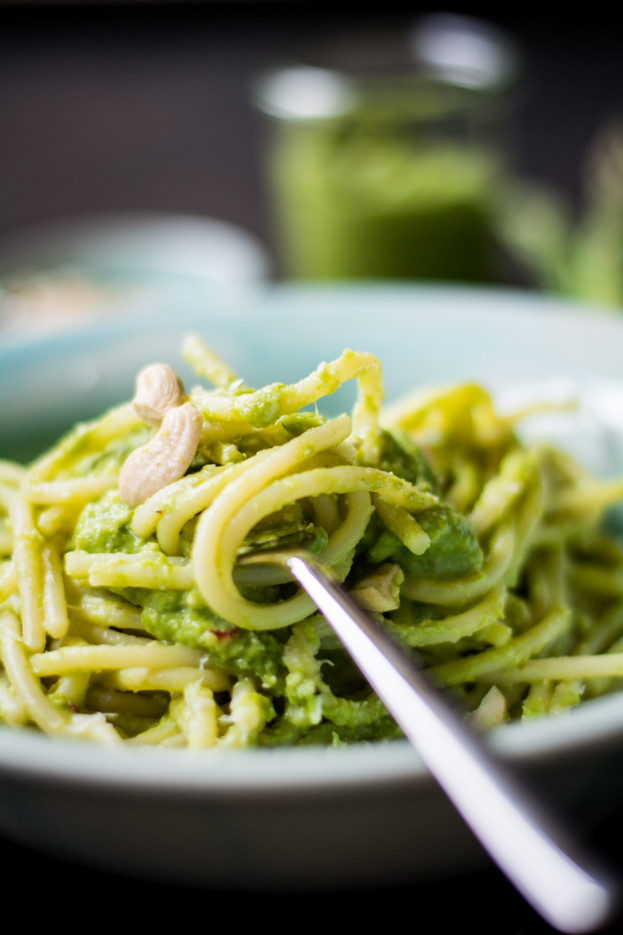 Aus dampfgegarten Spargelstangen, die besonders viel Eigengeschmack mitbringen, entsteht heute ein warmes Spargelpesto mit Cashewkernen und frisch gehobeltem Parmesankäse. Abgeschmeckt mit Limette und Chili. Ein super einfaches, besonders geschmacksintensives, vegetarisches Pastagericht, das ganz nach Geschmack mit Räucherlachs, Steakstreifen oder gebratenen Spargelstangen verfeinert werden kann. Zusätzliche Rezeptvariante für den Thermomix…