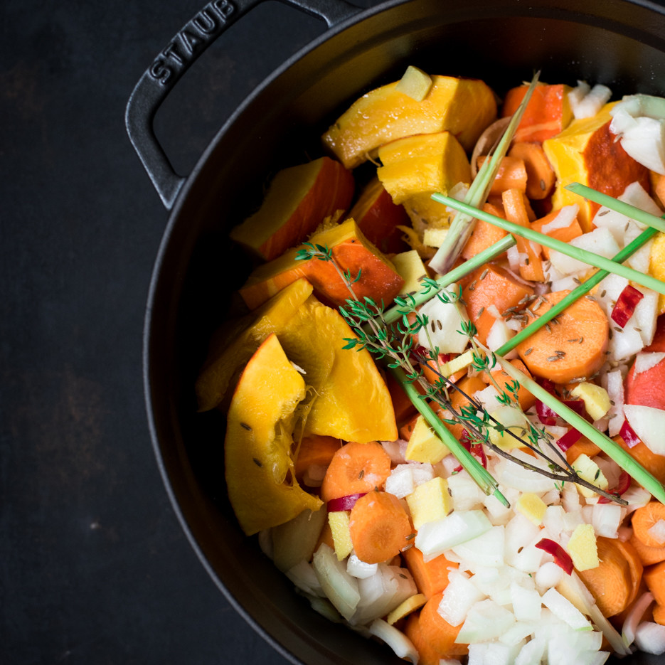 Ein Klassiker der Herbstküche: Hausgemachte Kürbiscremesuppe mit Gewürzen, wie Curry, Chili und Muskat, sowie Aromen von Ingwer, Äpfeln oder Kokos. Man kann sie mit unterschiedlichsten zusätzlichen Zutaten, Toppings und Gewürzen variieren und erhält jedes Mal einen komplett neuen Geschmack! In diesem Rezept spielen nicht nur die Zutaten, sondern auch die Zubereitungsart eine zentrale Rolle: Denn das Gemüse wird vor dem Pürieren fast eine Stunde im Ofen weich geröstet – so wird die Suppe besonders herzhaft und beinhaltet leichte Röstaromen. Perfekt für kalte Herbsttage!