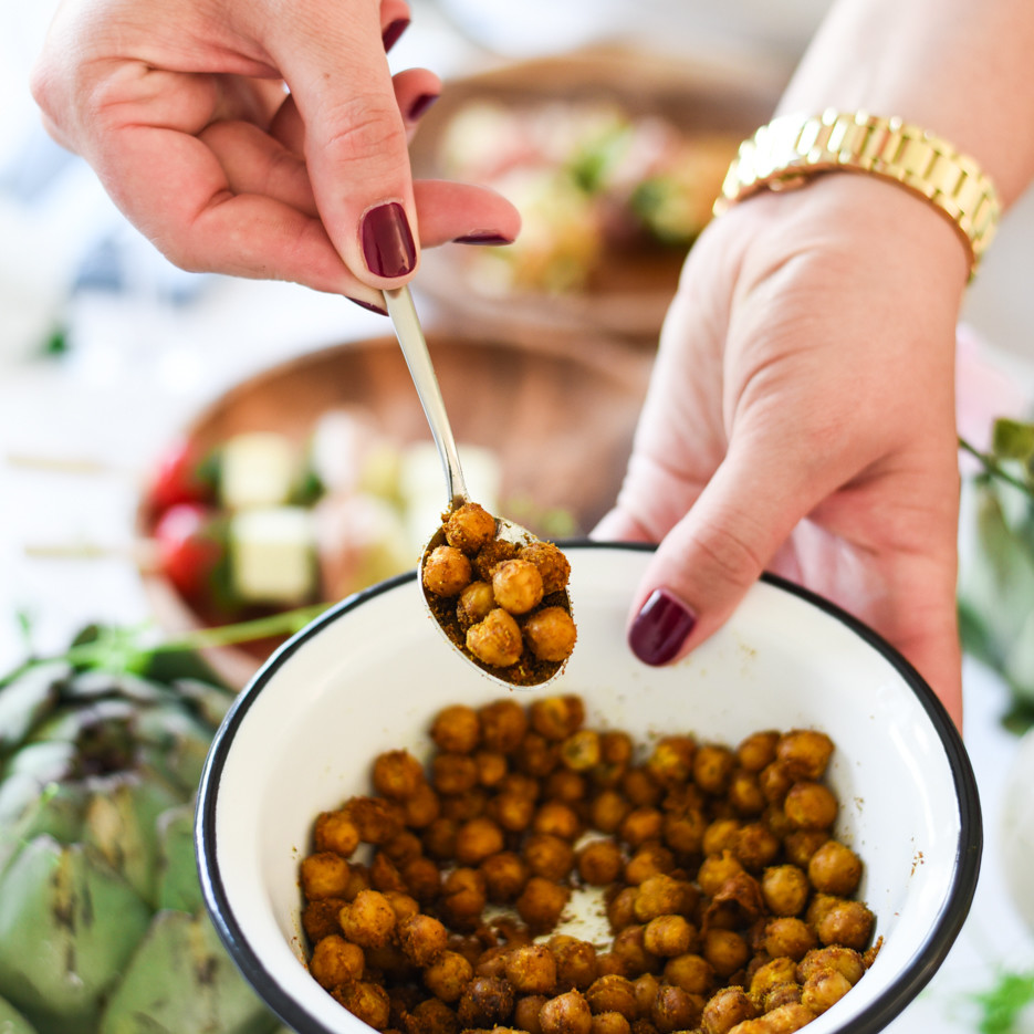 Snacks und Knabbereien sind ein Must-Have für jedes bunte Buffet. Herzhafte Kleinigkeiten, die den ganzen Abend bereit stehen und den kleinen Appetit zwischendurch stillen. Für unser Mädelsabend-Event mit den lieben Foodistas habe ich geröstete und afrikanisch gewürzte Kichererbsen mit Kokosöl beigesteuert, die ganz fix im Ofen gebacken sind und durch die afrikanische Gewürzmischung Raz el Hanout sehr fein würzig schmecken. Wir fanden: Mal eine sehr feine Alternative zu Chips & Co!