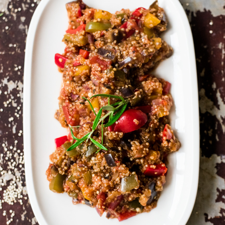 Quinoa-Risotto mit Paprika-Auberginen-Tomaten-Gemüse (vegan)