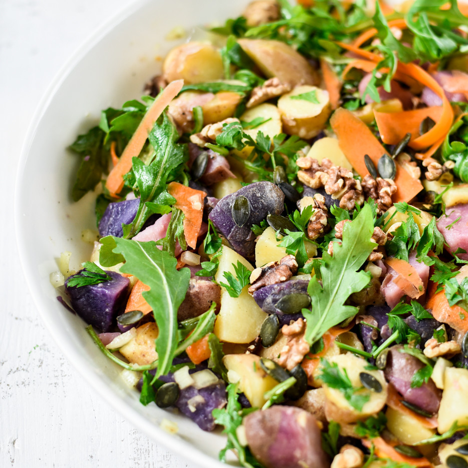 Was haben Rote Emmalie, Violetta, Angeliter Tannenzapfen, Oskar, Hela, Ackersegen, Rosa Tannenzapfen und die Rote Lötschentaler mit dem heutigen Beitrag zu tun? Sie bringen all die bunte Farbe in das heutige Rezept: Hinter den Begriffen verbergen sich blaue, gelbe, rote und violettfarbene Kartoffelsorten. Zusammen mit Karotten, Lauchzwiebeln, Rucola, gerösteten Kernen und einer Senf-Vinaigrette wird ein leichter und vor allem bunter Kartoffelsalat daraus!