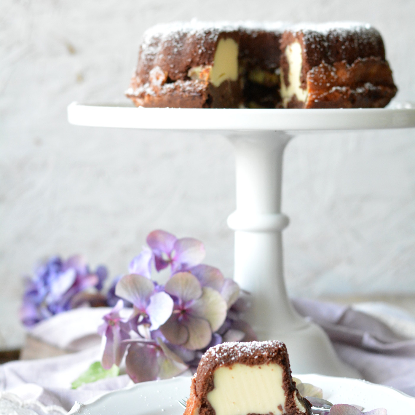 Für einen richtig gut gemachten Schokoladen-Gugelhupf, schön  saftig und fast ein bisschen schlotzig oder klitschig, lasse ich einiges stehen und liegen. Gleiches gilt für leckeren Käsekuchen. Ein Gedicht. Ich habe die beiden nun einfach mal in einer Napfkuchenform zusammengebracht: Herausgekommen ist ein unverschämt leckerer Schokoladenkuchen mit Käsekuchenfüllung.