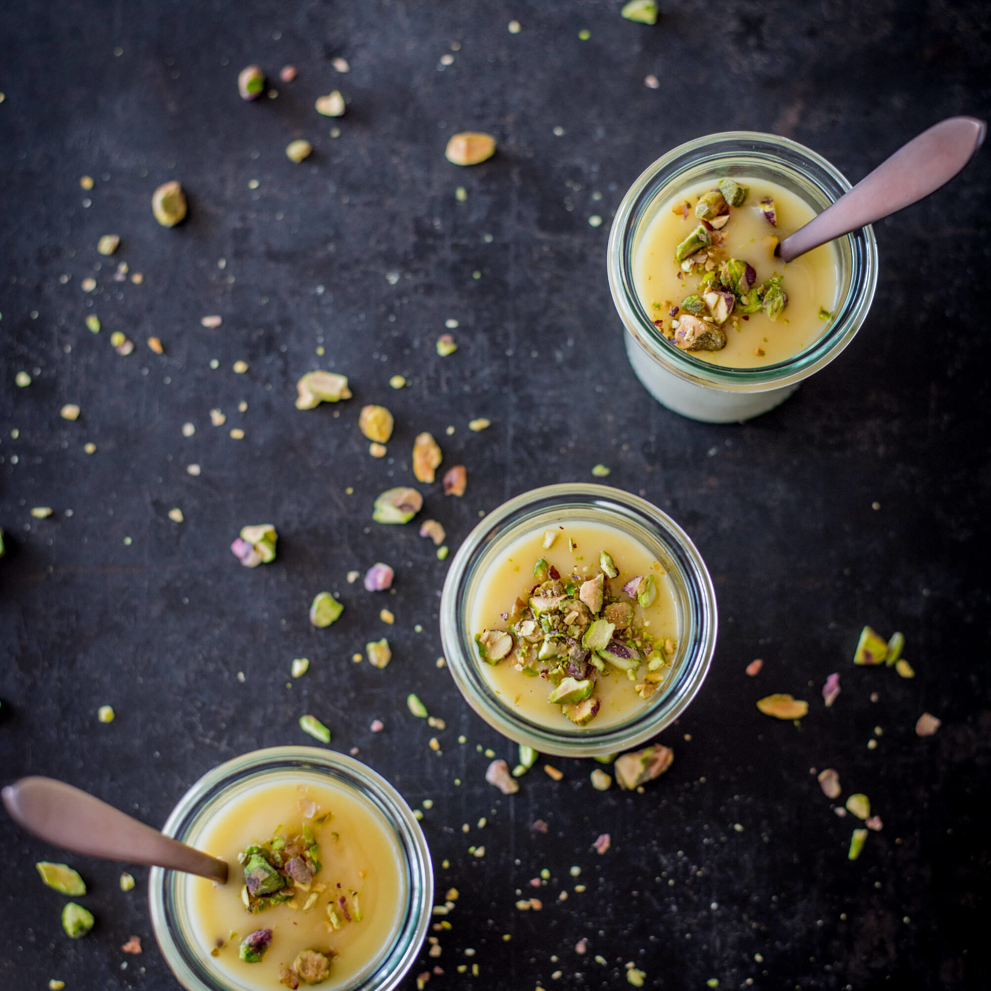 Vanille-Pannacotta mit Eierlikör und gerösteten Salz-Pistazien
