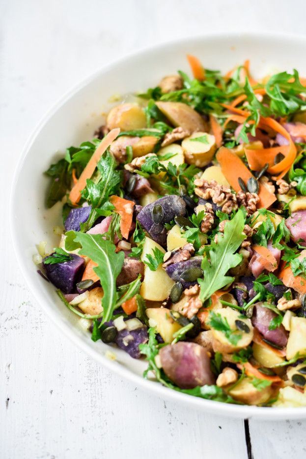 Was haben Rote Emmalie, Violetta, Angeliter Tannenzapfen, Oskar, Hela, Ackersegen, Rosa Tannenzapfen und die Rote Lötschentaler mit dem heutigen Beitrag zu tun? Sie bringen all die bunte Farbe in das heutige Rezept: Hinter den Begriffen verbergen sich blaue, gelbe, rote und violettfarbene Kartoffelsorten. Zusammen mit Karotten, Lauchzwiebeln, Rucola, gerösteten Kernen und einer Senf-Vinaigrette wird ein leichter und vor allem bunter Kartoffelsalat daraus!