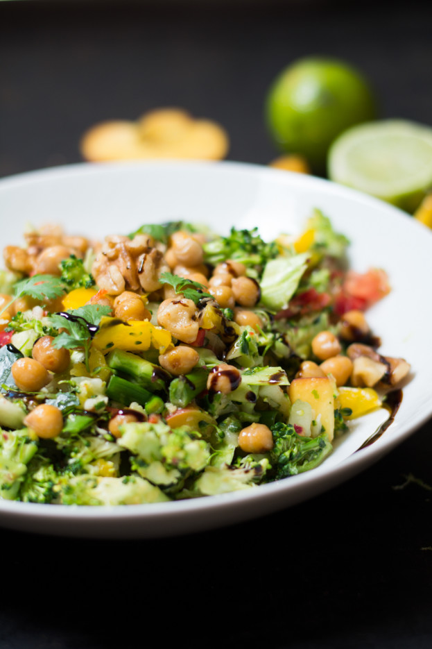 Brokkolisalat mit gebratenen Kichererbsen und Pfirsichvinaigrette